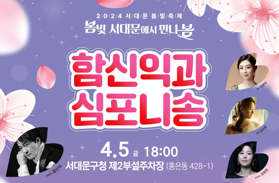 ▶ 4월 5일 오후 6시에는 '함신익과 심포니송 오케스트라'의 클래식 공연이 홍제천 카페폭포 인근 서대문구청 제2부설주차장에서 펼쳐집니다. 1000여 개의 좌석이 마련되어 누구나 공연을 즐길 수 있습니다.