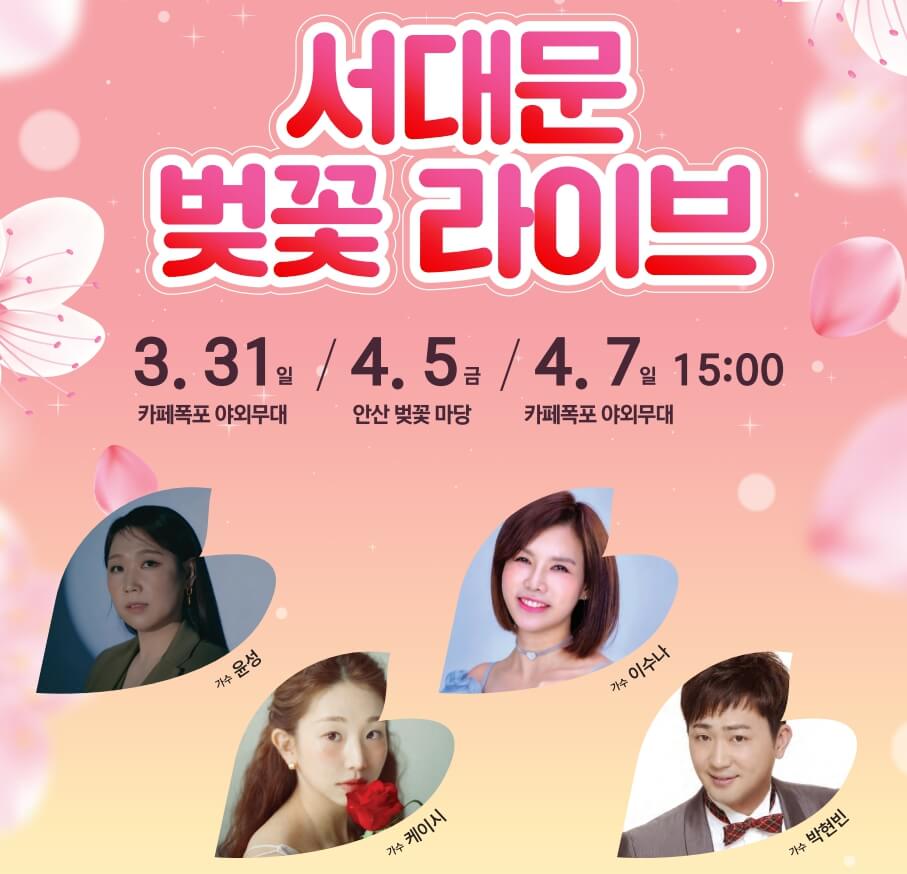 | 4. 5.(금) | 15:00 | 안산 벚꽃마당 | 서대문 벚꽃 라이브 디지털서울문화예술대학교 가수 이수나/가수 케이시 |