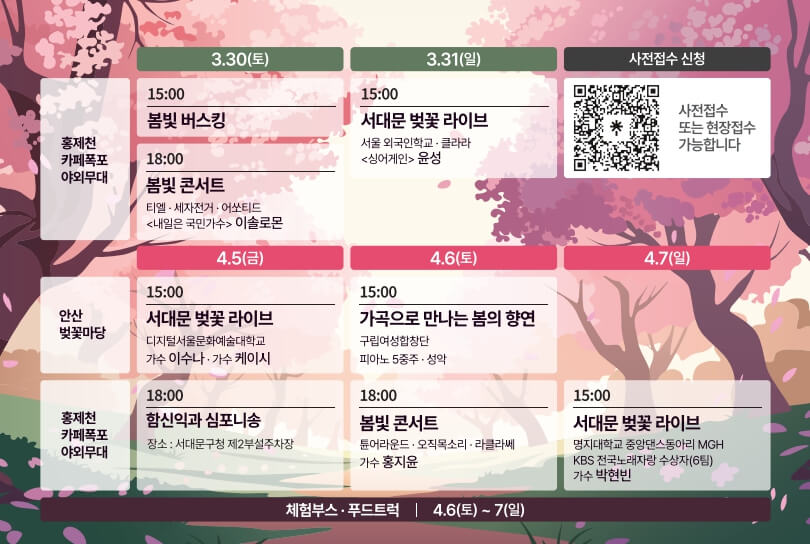 ✅ 행사내용: 봄빛콘서트, 서대문 벚꽃라이브, 함신익과 심포니송, 체험부스, 푸드트럭 등